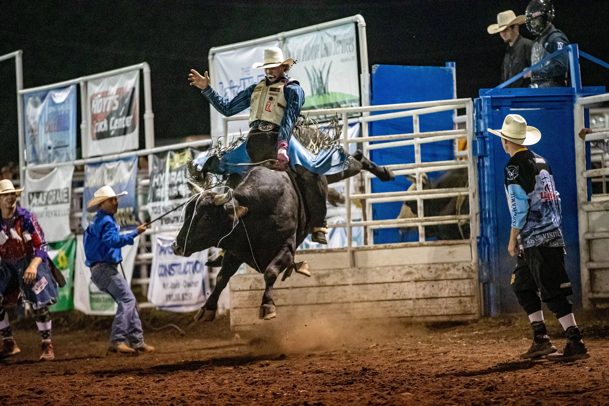 Bull riding is rodeo’s most dangerous event. In the chute, the bull rider settles on the bull’s back, wraps his braided rope around the bull’s girth, then loops the rope around his hand and back into his palm so he can grip it tightly. When he nods, the gate is opened and the bull lunges out of the chute. Spurring is optional – the primary goal is to stay on for eight seconds without touching himself, his equipment or the bull with his free hand. The cowboy will be scored highly for staying in the middle of the bull, in full control of the ride. If the ride lasts the required eight seconds, it is scored by two judges who assess difficulty (the bull’s spinning, jumping and kicking, lunging, rearing and dropping, and his side-to-side motion) as well as the cowboy’s degree of control. Each judge awards up to points for the cowboy’s performance and up to 25 points for the animal’s performance, for a potential of 100 points.